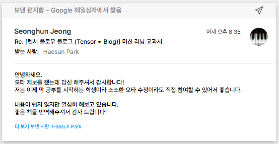 머신러닝 교과서(세바스찬 라시카 저, 박해선 번역, 길벗출판사)의 정오표에 이름을 남겼다.