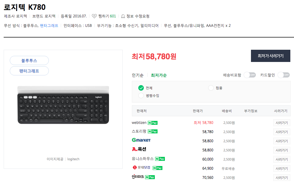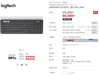 로지텍 블루투스 키보드인 k780을 사용하고 있다. 구입시기는 정확히 기억 안나지만 2017년 4월에 리뷰를 쓰려고 캡쳐한 것이 있는것을 보니 최소 2년 이상 사용한 것 같다. 당시에 비용과 상관없이 마음에 드는 블루투스키보드를 사고 싶어서 큰맘먹고 샀던 기억이 난다. 현재는 가격이 내렸지만 그래도 저렴한 편은 아닌 나름 고급 키보드이다.